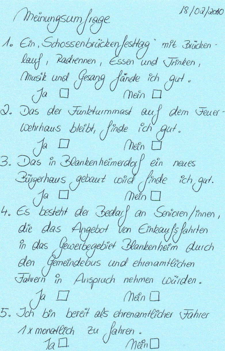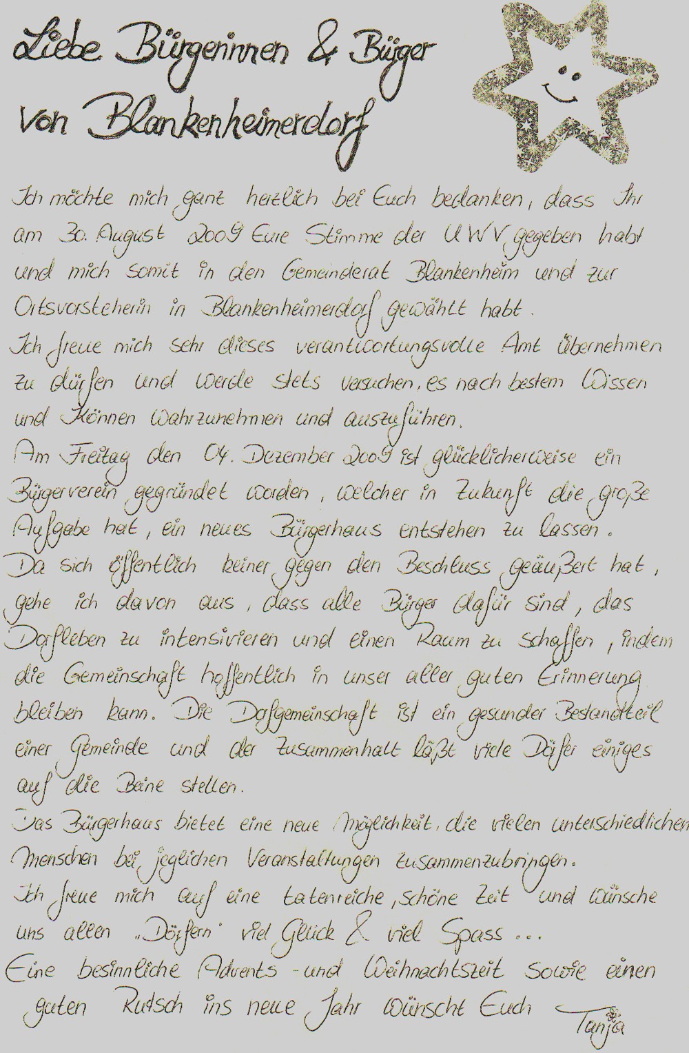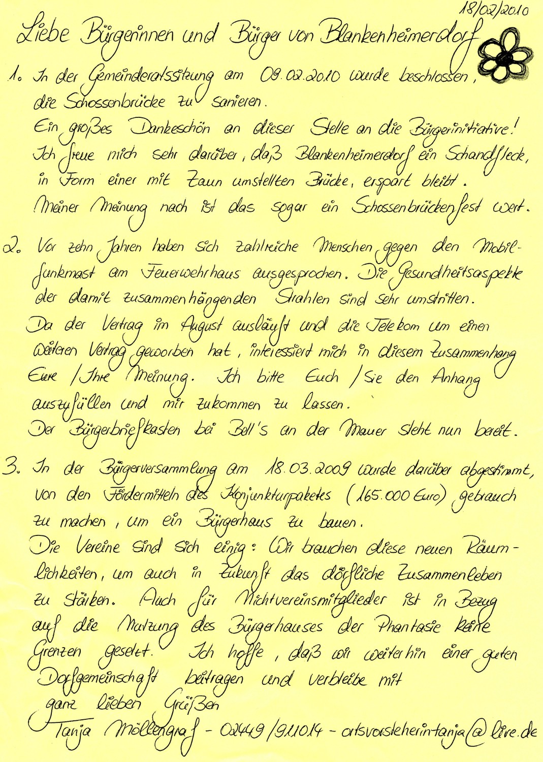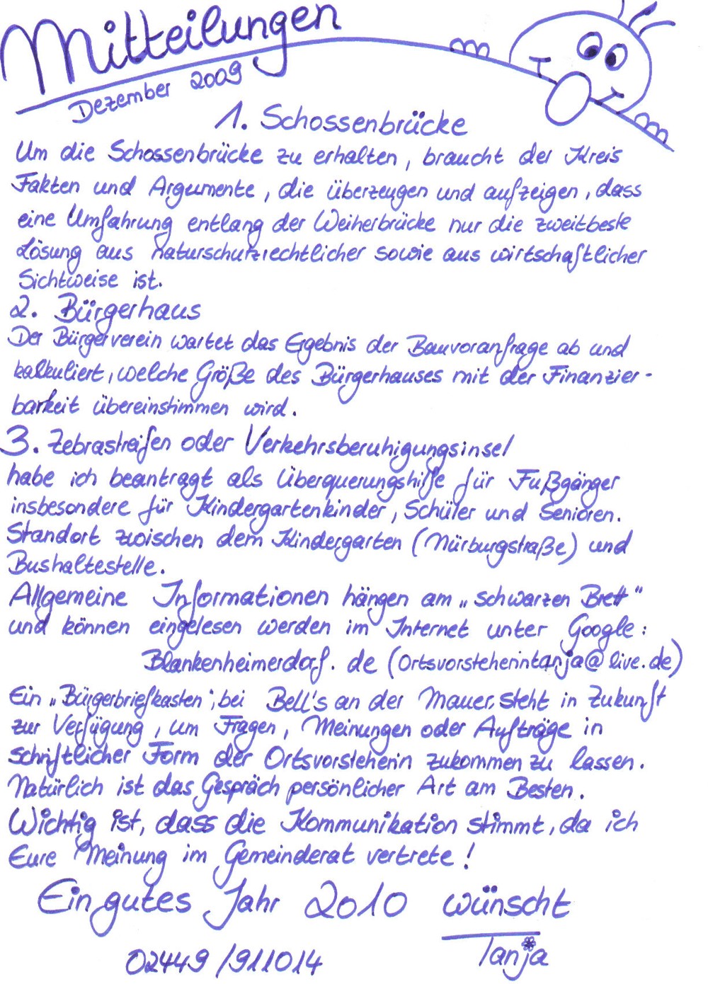 2011.12.24 Informationsblatt - Kindergarten - Reinigen/Senkkästen - Adventsingen - “Prommeallee” - Bürgerhaus - Silvesterparty - Krippenfeier - Fahne2011.11.29 Informationsblatt - “Prumme-Allee” - Bürgerhaus - Mitgliederversammlung - DSL Breitbandversorgung - Dank an die Dörfer Bürger2011.10.02 Informationsblätter - Neue Fahnen - “Prumme- Allee - Banner - Schülertickets - Bürgerhaus - Schützen - Sitzbänke - A1 - Windkraft - usw.2011.04.20 Informationsblatt - Kindergarten - Verkehrsschau - Dank - Bolzplatz - Kommunion - Bushaltehäuschen - Lambach-Pumpe - Ostergruß2011.03.10 Informationsblatt - Sportverein -Oldie Night - Tour de Ahrtal - 40 Jahre Wiesenfest - 100 Jahre Feuerwehr - Einweihung Bürgerhaus2011.03.06 Informationsblatt - Wiesenfest - Grabpflegedienst - Bürgerhausbau - Schrottsammelaktion - Gemeinderat - Leitbild Blankenheim2011.01.27 Informationsbrief - Verkehrssituation in unserem Dorf2010.12.14 Informationsbrief - Schrottsammelaktion - Bürgerhaus - Bushaltestellenhäuschen - Dorflinde - Kommunionsfest im Dorf am 8. Mai 2011 - 2010.09.07 Information über die Schossenbrücke - Bürgerhaus - Dorfverschönerung - Schrottsammlung - dörfliche Instandsetzungen - Vereinskartell2010.06.08 Informationsbrief - Radweg - Mobilfunk - ÖPNV Barrierefrei - Piktogramme - Schossenbrücke - Bürgerhaus - Bushaltestellenhäuschen2010.04.22 Informationsbrief - Bürgerbriefkasten - Kindergarten - Schossenbrücke - Bushaltehäuschen - Feuerwehr - Bürgerhaus2010.02.18 Informationsbrief -Schossenbrücke-Mobilfunkmast-Bürgerhaus2010.02.18 Meinungsumfrage -Schossenbrückenfest-Funkturmmast-Bürgerhaus-Einkaufsfahrten für Senioren2009.12.31 Informationsbrief - Schossenbrücke - Bürgerhaus - Zebrastreifen - Bürgerbriefkasten2009.08.00 Liebe Bürgerinnen und Bürger von Blankenheimerdorfzurück