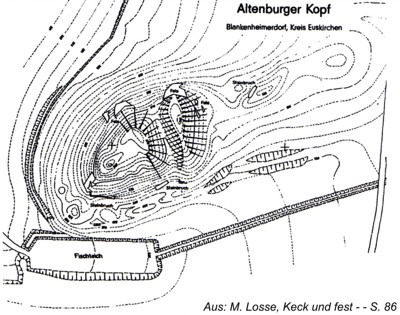 In unserer Jugendzeit wurden vielerlei Geschichten erzählt um die Altenburg. Sogar der fränkische König Chlodwig - der sich in Erfüllung seines Gelübdes vor der Schlacht bei Zülpich 496 taufen ließ - soll hier ein Jagdschloß gehabt haben. Auch von unterirdischen Gängen war die Rede. In einer kleinen Schrift erzählt der Dörfer Pfr. Ewald Dümmer († 1988) von einer Fliehburg, die auf der Altenburg gestanden habe und „heute noch gezeigt wird.“ Alles das ist in das Reich der Phantasie zu verweisen. Richtig aber ist seine Bemerkung, daß „dort unten noch viele historische Geheimnisse verborgen liegen, die es zu ergründen gilt.“ Einiges hat die wissenschaftliche Forschung bisher über die Altenburg herausgebracht und veröffentlicht. (3) Als der „Tiergarten-Tunnel-Wanderweg“ eingerichtet wurde, stellte man auch eine Orientierungstafel am „Altenburger Kopf“ mit den wichtigsten Informationen auf. Zwar sehr knapp gehalten, aber das Wesentliche kann der interessierte Wanderer entnehmen. (4)