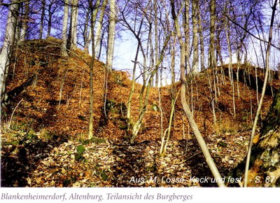 Inmitten dieser sumpfigen Talaue, die zusätzlich durch Anstauen kleinerer Bäche überflutet werden konnte, erhebt sich der knapp 40 m hohe und 100 m lange Kalkfelsen. Die Burg auf der Höhe wurde wohl im 10. Jhdt. errichtet. Die dort gemachten Keramik-Funde datieren ins 13. – 15. Jhdt. Zu der Zeit war die Altenburg demnach noch bewohnt, in den Jahren 1483 und 1493 werden urkundlich „Herren von Aldenburch“ erwähnt. Noch 1652 wird ein Peter von der Aldenburg genannt, der „jetzo im Dorf Blankenheim wohne“. (6) Die heutige Burg in Blankenheim wird im Jahre 1273 zum ersten Mal in einer Urkunde erwähnt. Demnach hat sie wohl Mitte des 12. Jhdts. in ihrer frühen Form existiert. Es ist demnach gar nicht ausgemacht, wo denn der 1112 urkundlich erwähnte „her gerard de Blanchinheim“ oder der 1222 erwähnte „dominus de Blankenhem“ gelebt haben: Noch oder nicht mehr auf der Altenburg, oder schon oder noch nicht auf der neuen Burg über der Ahr. In einem Aufsatz (7) fand sich folgende knappe Zusammenfassung: „Die Herren von Manderscheid-Blankenheim waren das einflußreichste Geschlecht der Region und können mit der ersten Erwähnung von „Blancio“ im Jahre 721 auf eine sehr frühe Geschichte zurückblicken. Ihr ursprünglicher Stammsitz war aber die „Alteburg“ bei Blankenheimerdorf, heute als repräsentative Motte erhalten, von der sie erst im 12. oder 13. Jhdt. an den strategisch wichtigen Ort über der Ahrquelle übersiedelten.“